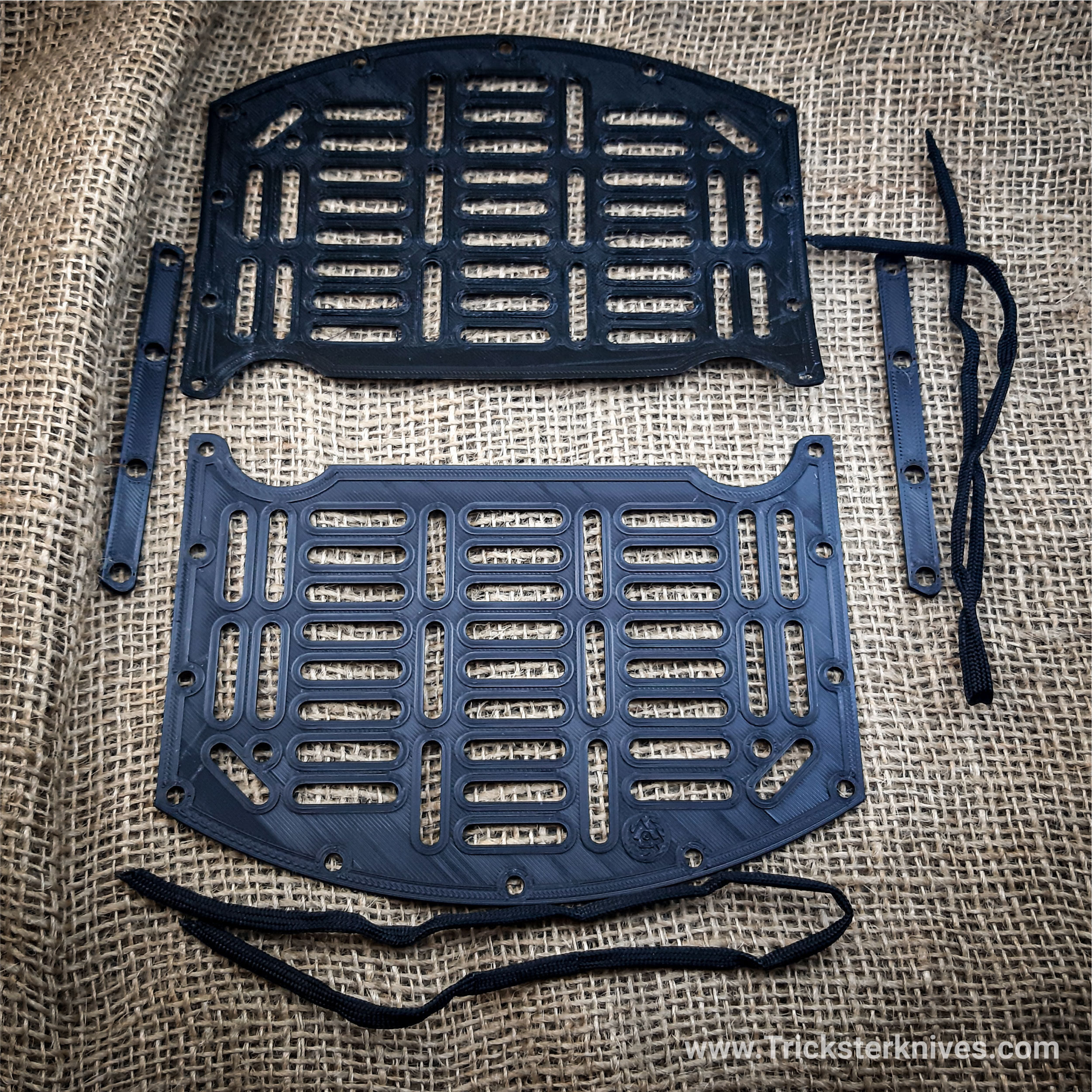 It is made from 2 different materials. The outer shell and spacers are made out of PLA, the inner shell out of TPU. Those parts are connected with either paracord or 4mm chicago screws. The PLA side provides much needed rigidity while the TPU is compliant enough that the whole system can match the shape of your body.
